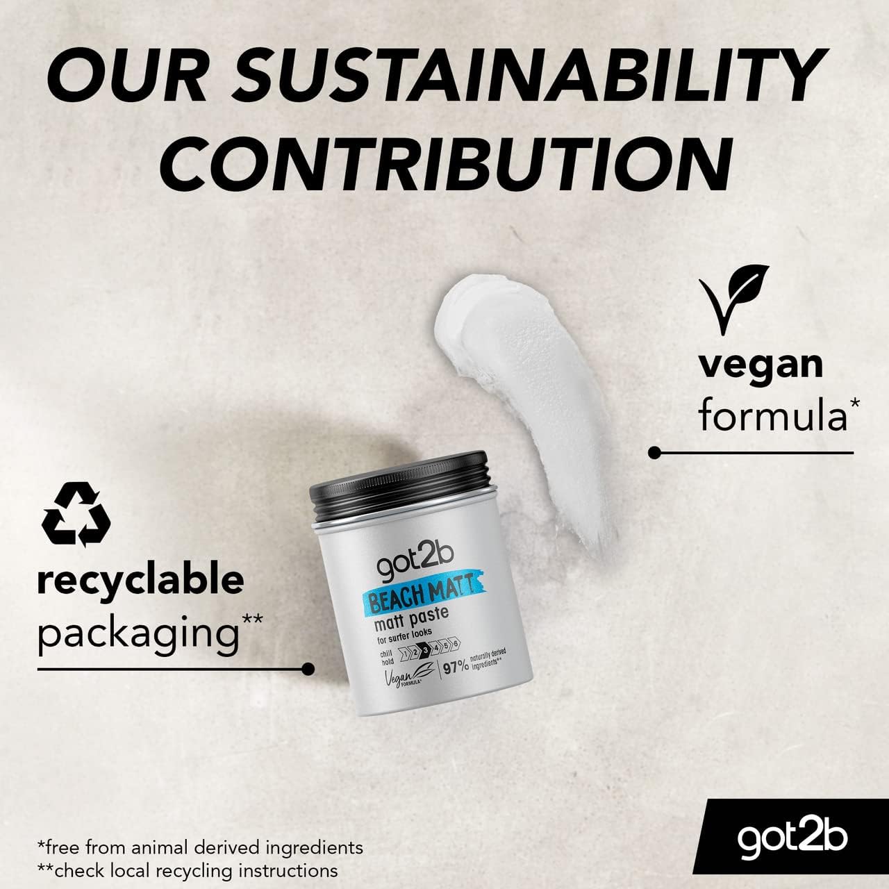 Got2b beach matt paste #1 line in styling paste in the UK Source: Circana All Outlets UK (exc. Discounters), Styling Paste (as defined by client) value sales for 52 w/e 21st January 2024 A surfer look matt-paste Increases friction between the hair fibres Use on damp or dry hair; Rub into your palms and tousle, twitch or flatten single sections as you like Get the surf style look, Whether tousled, dishevelled, tame or straight – main thing: it’s matt