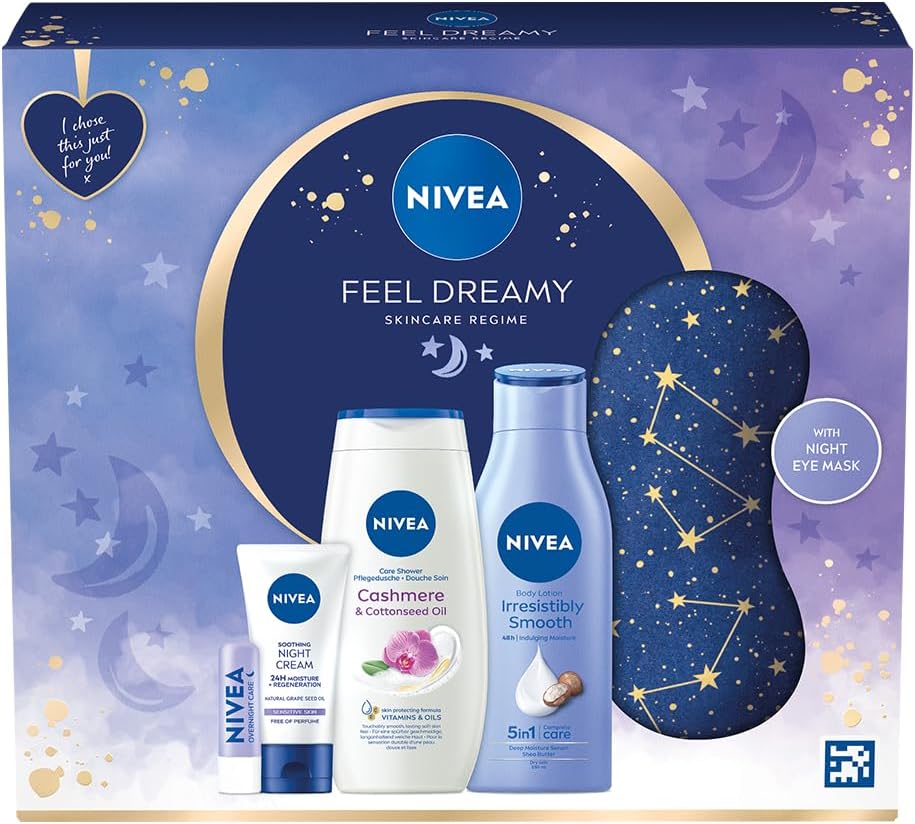 NIVEA Feel Dreamy Skincare Regime Gift Set, Women’s Gift Set Includes Shower Cream, Body Lotion, Night Cream, Lip Balm, and Eye Mask