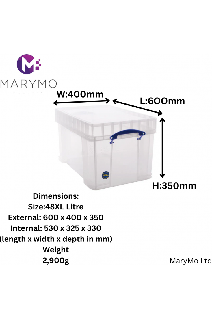 - This extra large Really Useful Box has a 48 litre capacity. It is a transparent, solid plastic box for multi-purpose storage.